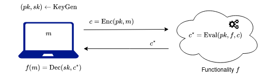 In the image above, the user with the laptop is interested evaluating a certain circuit on its data . Therefore it sends its data, encrypted, to the cloud so that the cloud computes the circuit. By correctness, the user indeed gets the circuit applied on its data .